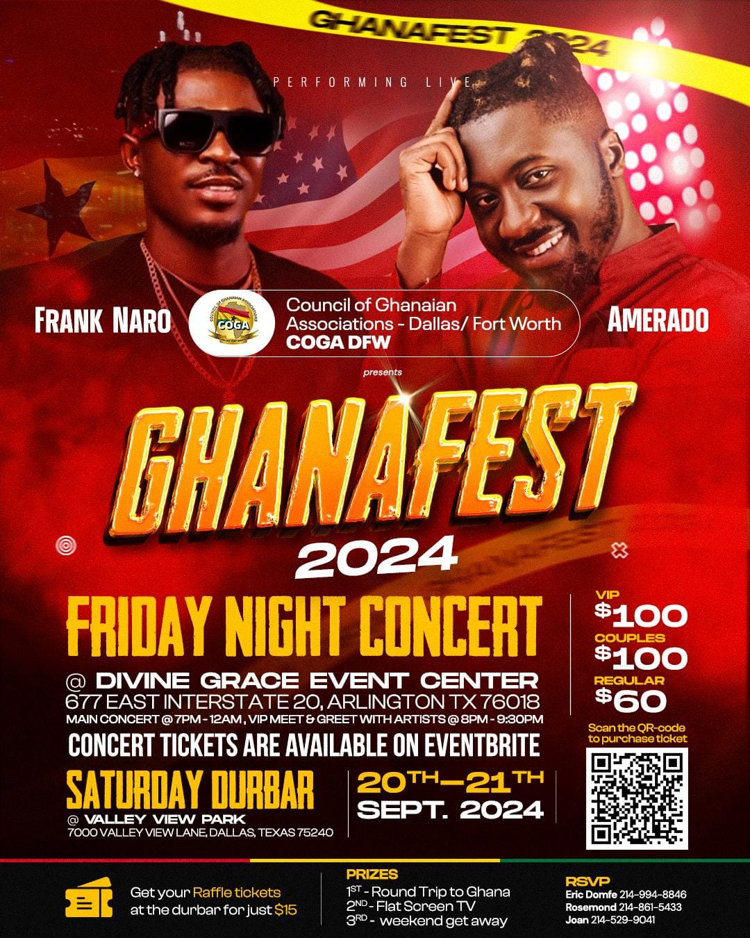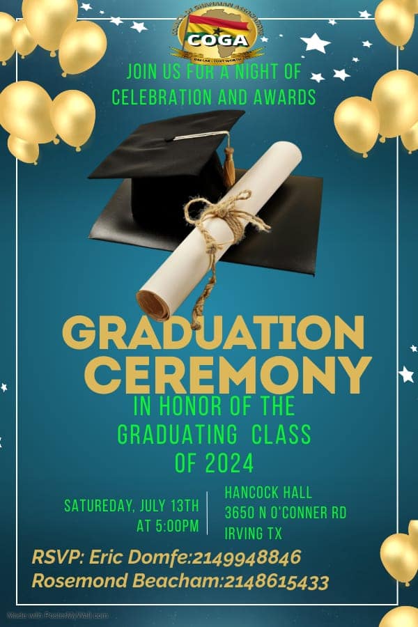 Coga-dfw in collaboration with all member associations bring you Ghana@68 Kente/traditional dinner dance and it's annual graduation ceremony. Use the QR code to register your graduates. ALL REGISTERED GRADUATES COME IN FREE. Get your dinner dance tickets from any of the coga reps at any African Markets or call the numbers on the flyer for more information. Come let's celebrate our heritage. See you there 💃🕺💃🍝🍜🍛🍾🥂🍹🍷🍮