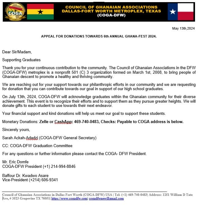 The Council of Ghanaian Associations in Dallas Forth Worth(COGA -DFW) is a (501c)3 non-profit organization which seems to bring people of Ghanaian descent together under one umbrella to promote a healthy and thriving community.