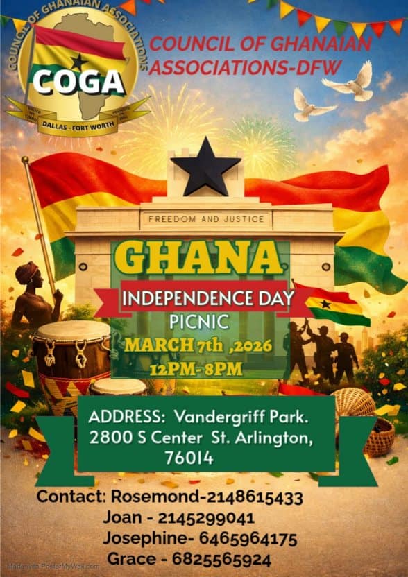 It's our annual 6th March Independence day picnic by Coga-dfw. Come and let's break bread together and thank God for how far He has brought our motherland Ghana. Especially for the PEACE that has prevailed in our country. Come and enjoy different Ghanaian dishes, games, music etc. It's our Independence day, let's celebrate it.